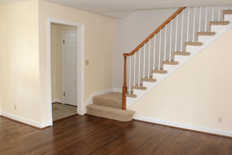 We suggested using a color drench as a way to create a bold, warm welcome as you enter. Pairing the proposed color scheme for the remainder of the residence renovations with a bold oxblood paint created a sense of contrast where before, as we can see in the before picture, it was quite a bit of creamy-off white extending throughout the first floor.